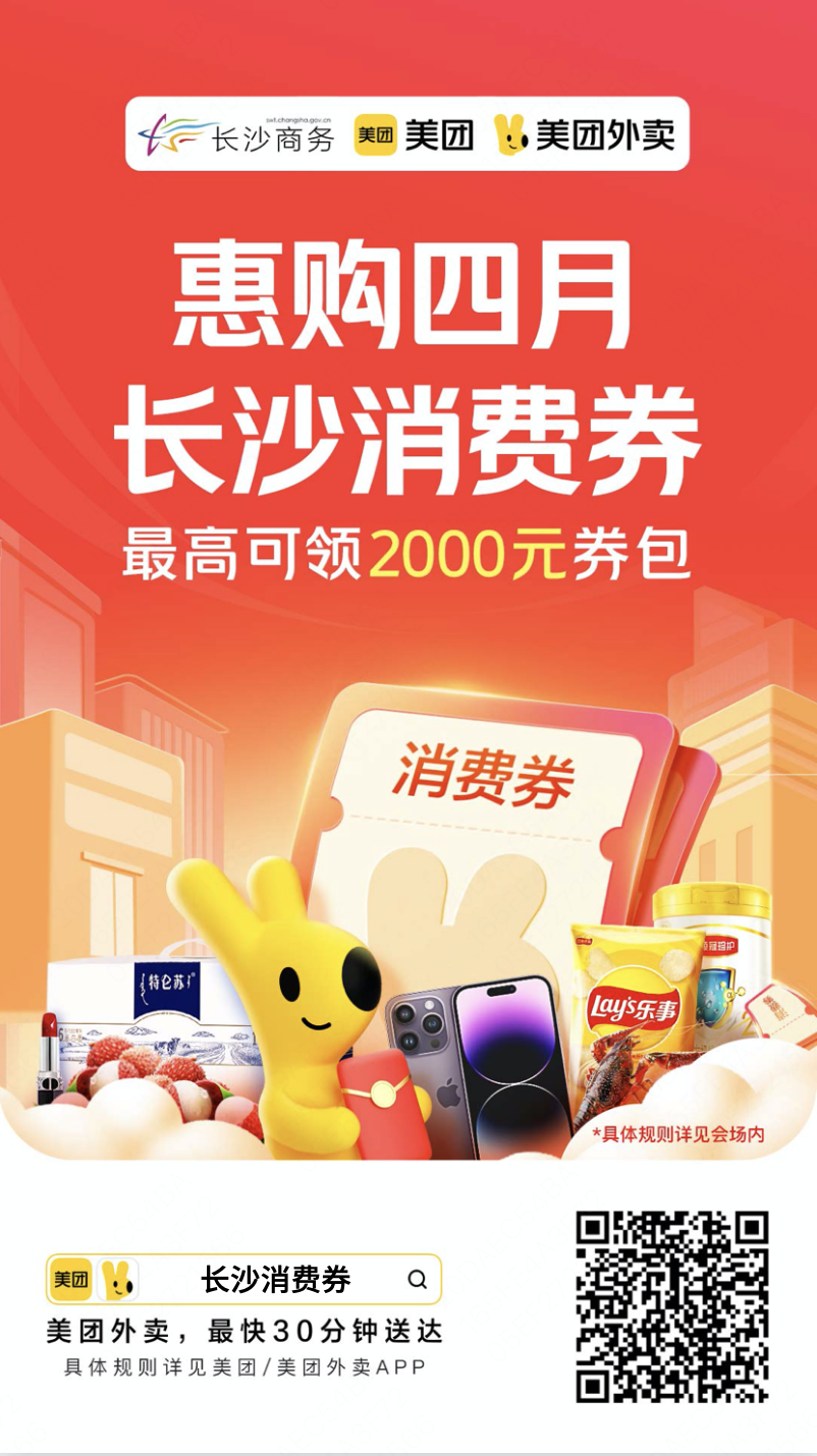 今年以来,长沙把恢复和扩大消费摆在更加突出的位置,推出长沙市“2023 消费提振年”系列活动。为进一步激发消费活力,美团外卖在长沙市商务局指导下,在长沙发放1300万超市百货消费券。即日起至4月24号,消费者在美团或美团外卖App搜索“长沙消费券”,即可进入活动会场领取优惠。领取后即可在小米之家、Apple 授权专营店、苏宁易购、新佳宜、菜老包、屈臣氏等活动指定商家外卖购物时使用,最快30分钟,骑手即可将商品送货上门。