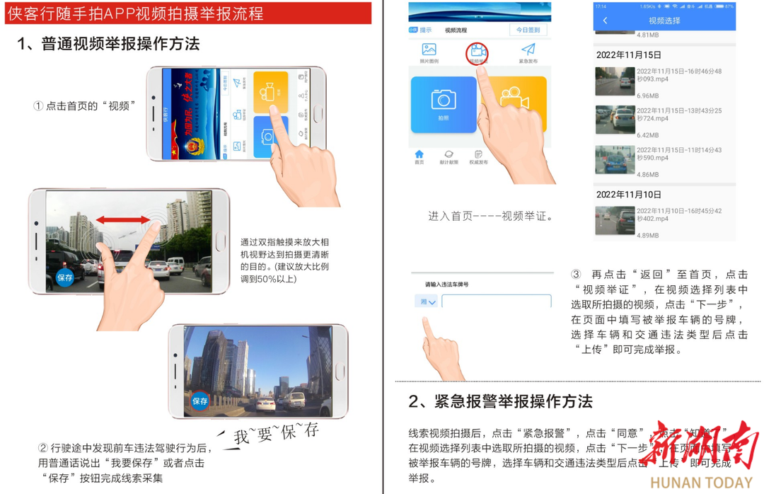 普通视频举报操作方法:车辆启动前,将手机用支架固定在内后视镜处,点击首页的“视频”,行驶途中发现前车违法驾驶行为后,用普通话说出“我要保存”或者点击“保存”按钮完成线索采集,再点击“返回”至首页,点击“视频举证”,在视频选择列表中选取所拍摄的视频,点击“下一步”,在页面中填写被举报车辆的号牌,选择车辆和交通违法类型后点击“上传”即可完成举报。