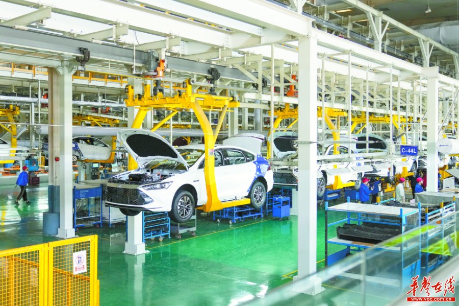 4月8日,比亚迪长沙基地总装车间,工人在新能源汽车生产线上忙碌。今年1至2月,比亚迪新能源汽车产量增长1倍。