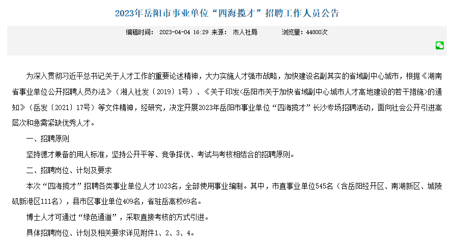 本次“四海揽才”招聘各类事业单位人才1023名,全部使用事业编制。其中,市直事业单位545名(含岳阳经开区、南湖新区、城陵矶新港区111名),县市区事业单位409名,省驻岳高校69名。
