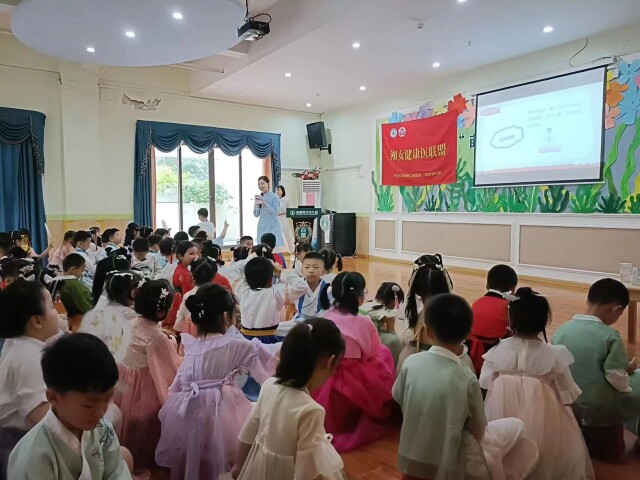 现场,中南大学湘雅口腔医院儿童口腔科医生李磊涛围绕趣味科普绘本《牙齿大街的新鲜事》,为孩子们讲解学龄前儿童口腔保健、龋齿预防等知识,手把手教孩子们正确的刷牙方式,帮助他们养成良好的口腔保健习惯,鼓励他们争当口腔保健宣传员。