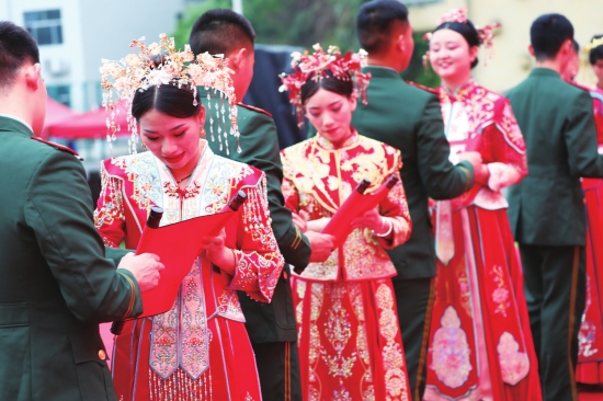 (武警湖南总队湘西支队首届集体婚礼上的甜蜜瞬间。)