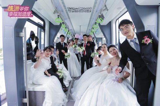 这场集体婚礼筹备了很久。今年二月,主办方中共株洲市委、株洲市人民政府就向全国发出婚服设计征集令,为新人设计独一无二的都市婚服,最终七款设计脱颖而出,由株洲知名服饰企业承接制作。婚车也是株洲独有。特别定制涂装的31米粉红智轨亮相株洲街头,吸引全城目光。50对新人乘坐着这辆粉红色的接亲婚车环绕全城,一路上引得市民拍照分享。株洲产的通用飞机“欧若拉”在婚礼现场“展翅迎宾”,为新人撑足排面,也为观礼的株洲市民近距离一饱眼福。