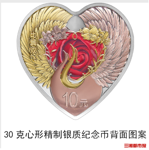 3克心形金质“比翼双飞”纪念币背面图案为双鹤齐飞装饰组合图案,并刊“比翼双飞”字样及面额。30克心形银质“比翼双飞”纪念币背面图案为双鸟、玫瑰、百合等装饰组合图案,并刊“比翼双飞”字样及面额。