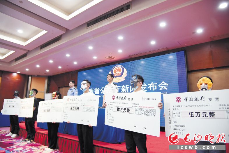 新闻发布会现场,6名有功举报人头戴面具领取公安部门发放的奖金。长沙晚报全媒体记者 刘琦 摄
