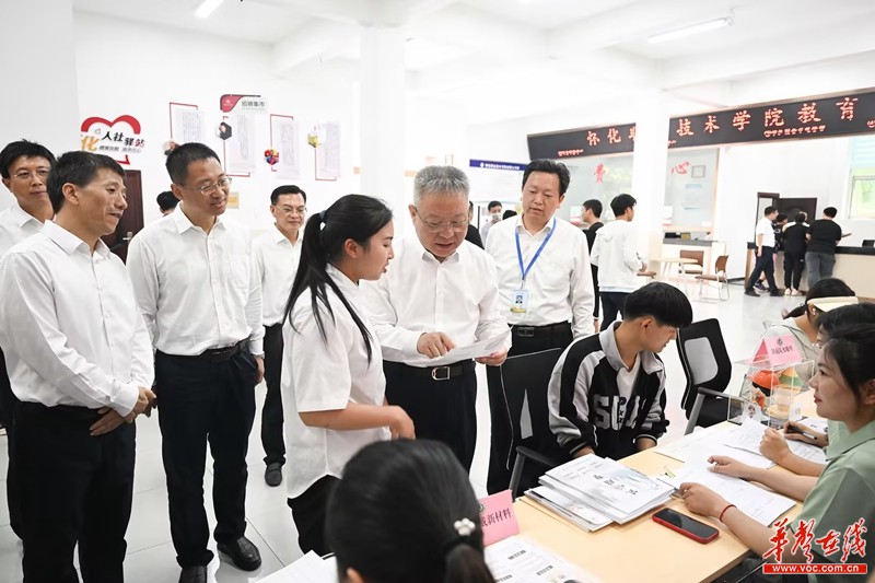 怀化职业技术学院由安江农校与怀化机电工程学校于2003年合并组建而成,袁隆平院士曾在安江农校工作生活37年。沈晓明来到学校,了解袁隆平院士及其科研团队在学校研究培育杂交水稻的历程,以及学校人才培养、种业创新等情况,并走进设在校内的人社驿站,与正在投递求职简历、与用人单位面对面洽谈的学生作交流。他指出,要立足专业优势,加大高素质技能人才培养力度,完善就业服务工作机制,深化校企合作,促进毕业生高质量充分就业。
