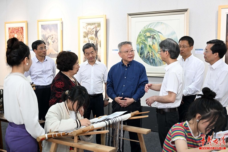 在湖南工艺美术职业学院,沈晓明参观了学校服务乡村振兴文创设计成果展示,走进湘绣、侗锦非遗实训教学课堂,仔细询问学校技能人才培养、非遗传承保护、学生创新创业等情况。他勉励职业院校要立足定位,坚守初心,发挥优势,主动对接和服务经济社会发展,培养更多高素质技术技能人才,在技能报国、技能兴湘中展现更大担当;要找准传统技艺与市场需求的契合点,勇于创新,让经典成为时尚。