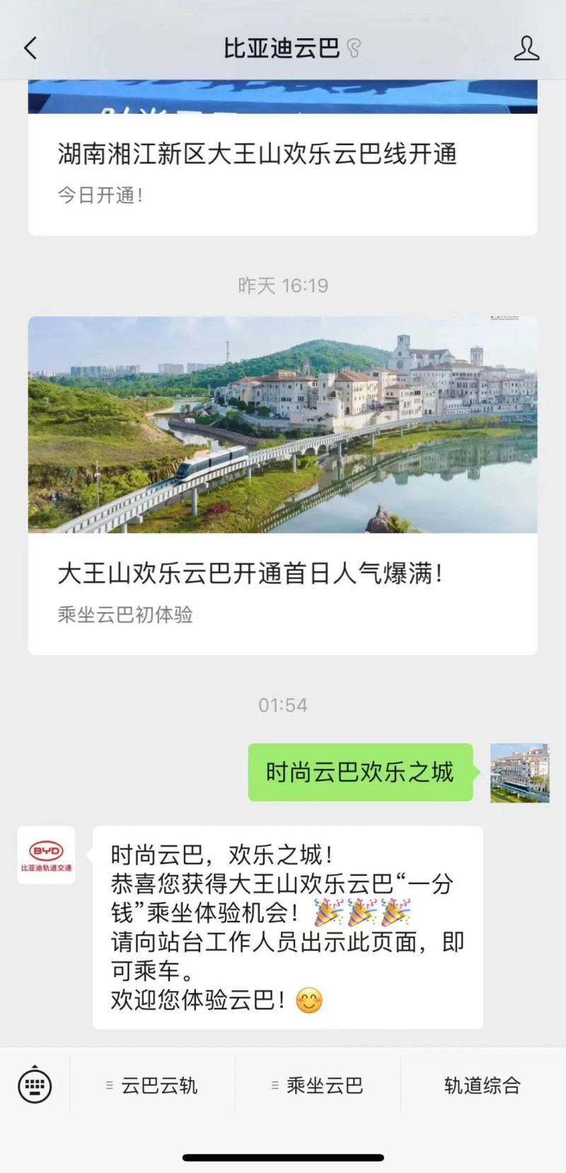 长沙晚报掌上长沙5月11日讯(全媒体记者 陈焕明)5月9日,湖南湘江新区大王山欢乐云巴正式开通,各车站客流火爆,首日客流便突破2万人次。11日,深圳比亚迪轨道交通运营有限公司发布公告,由于配合重大接待,大王山欢乐云巴在今日下午5时前无法为市民乘客提供服务,下午5时之后云巴正常开放进站。恰逢母亲节来临之际,乘车活动延长至5月14日,届时市民只需要0.01元和关注“比亚迪云巴”公众号就可以乘坐云巴。