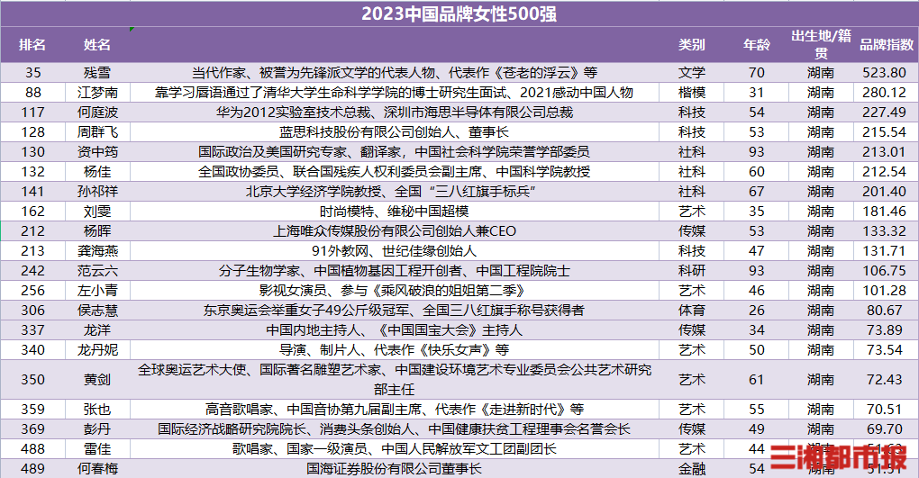 三湘都市报·新湖南客户端5月8日讯(全媒体记者 李成辉 通讯员 祝盈)近日,由品牌联盟(Topbrand Union)主办、郑州市人民政府支持的2023中国品牌节第十六届节女性论坛在郑州国际会展中心举行。活动期间,中国品牌节发起人、品牌联盟董事长王永揭晓了《2023 TopBrand中国品牌女性500强》,20位湘籍女杰上榜。