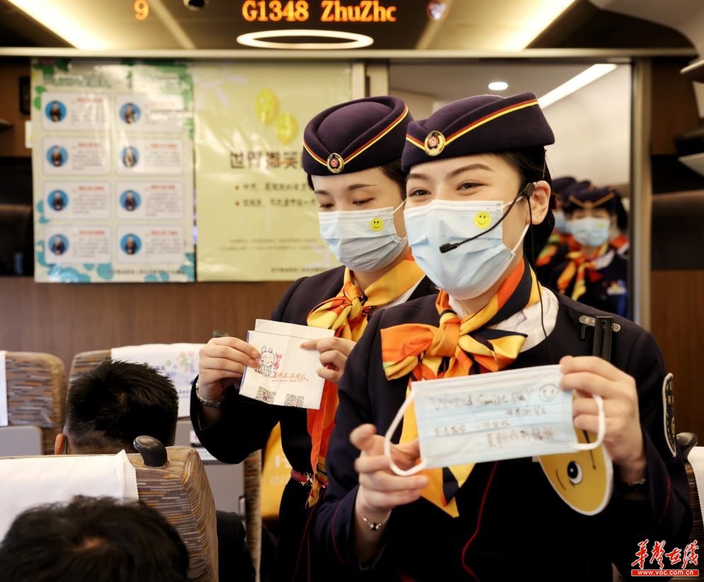 华声在线5月8日讯(记者 卢小伟 通讯员 章秋 石紫嫣 )5月8日是第75个世界微笑日,广铁集团长沙客运段高铁动二车队女子乘务组“杜鹃组”的靓丽动姐们在G1348次(株洲西-上海虹桥)复兴号动车组上向旅客们展示微笑礼仪举办世界微笑日活动。