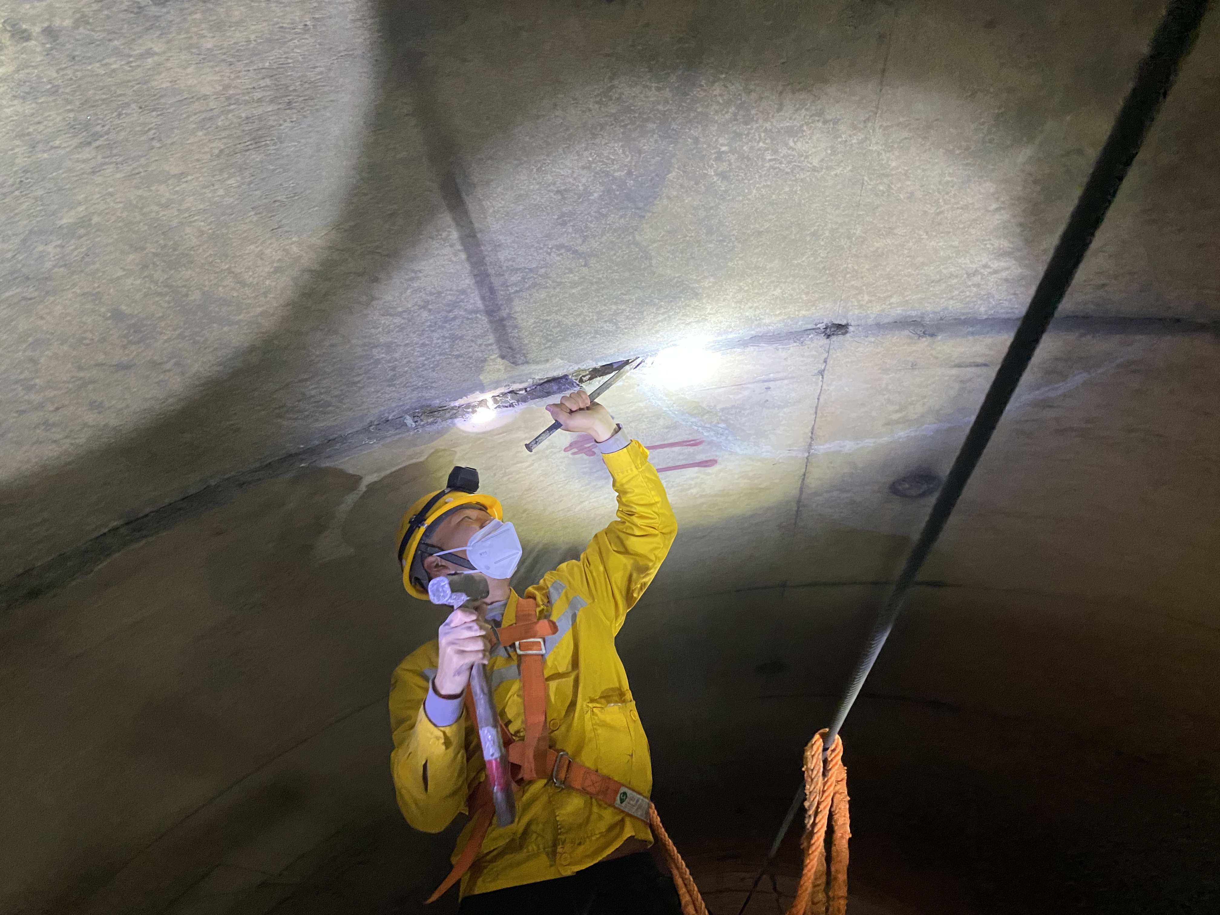 随着作业平台移动,手握敲击棒的周双朝开始逐米敲击隧道顶及隧道壁。 为了不遗漏每一个问题点,他会用红色油漆对问题点进行标记,并在记录本上详细记录位置和病害。