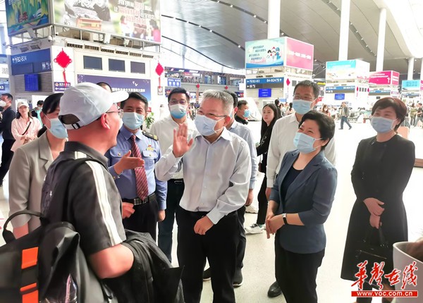 (5月1日,沈晓明来到长沙黄花机场,仔细询问节日客流和交通出行情况,看望慰问一线工作人员和青年志愿者。)