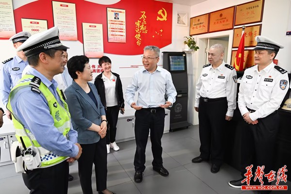 (5月1日,沈晓明来到松桂园交警岗亭,仔细察看交警指挥平台系统,并向大家致以节日的祝福和慰问。)