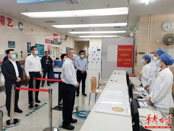 (5月1日,沈晓明来到湘雅医院,重点了解医院信息化应用、医疗服务保障等情况,看望慰问一线医疗工作人员。华声在线全媒体记者 郭立亮 唐俊 摄)