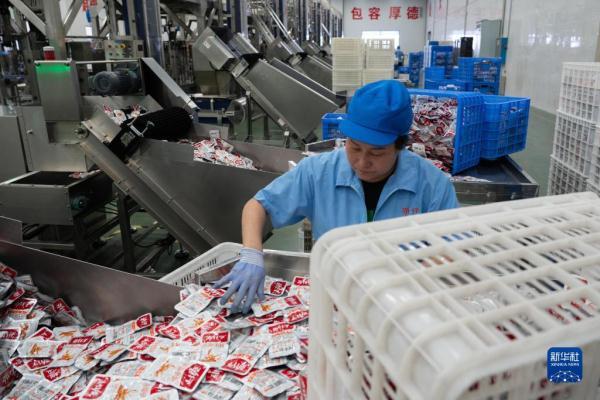 在湖南省岳阳市平江高新技术产业园,劲仔食品平江生产基地的员工将鳀鱼产品装箱(6月28日摄)。新华社记者 陈晔华 摄