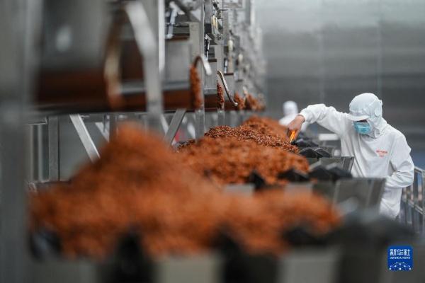 在湖南省岳阳市平江高新技术产业园,劲仔食品平江生产基地员工在生产线上检查产品(6月28日摄)。新华社记者 邹予 摄