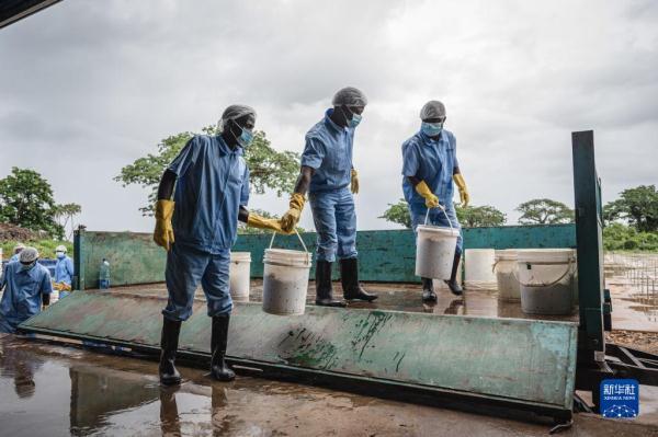 在肯尼亚夸莱郡希莫尼镇,工作人员将新鲜鳀鱼搬运至初加工厂(6月22日摄)。新华社记者 王冠森 摄