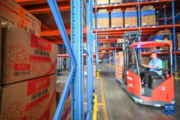 在湖南省岳阳市平江高新技术产业园,劲仔食品平江生产基地的员工在成品仓库里驾驶叉车搬运鳀鱼产品(6月28日摄)。新华社记者陈晔华 摄