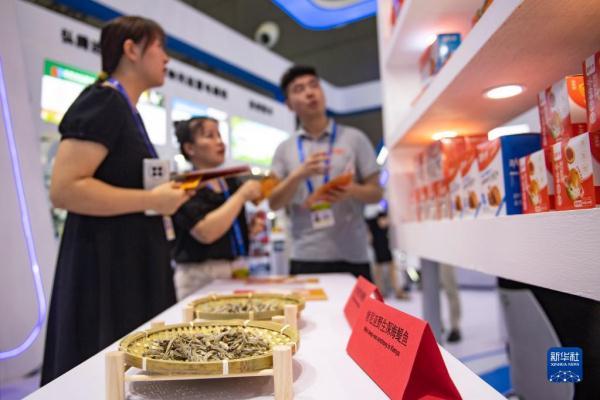 在第三届中非经贸博览会主展馆长沙国际会展中心,展商工作人员向观众介绍鳀鱼产品(6月29日摄)。新华社记者 孙瑞博 摄