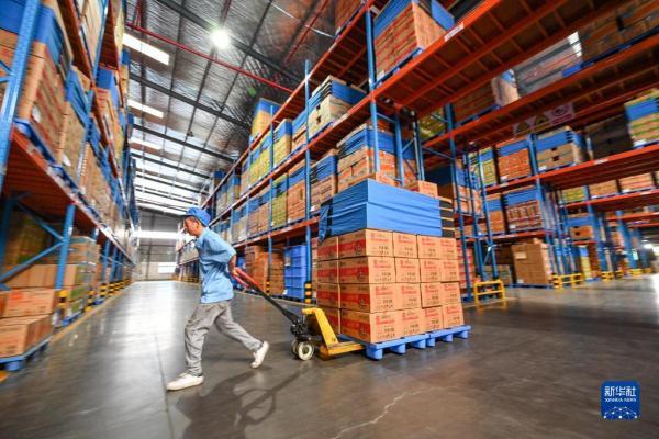 在湖南省岳阳市平江高新技术产业园,劲仔食品平江生产基地的员工在成品仓库里搬运鳀鱼产品(6月28日摄)。新华社记者 陈晔华摄