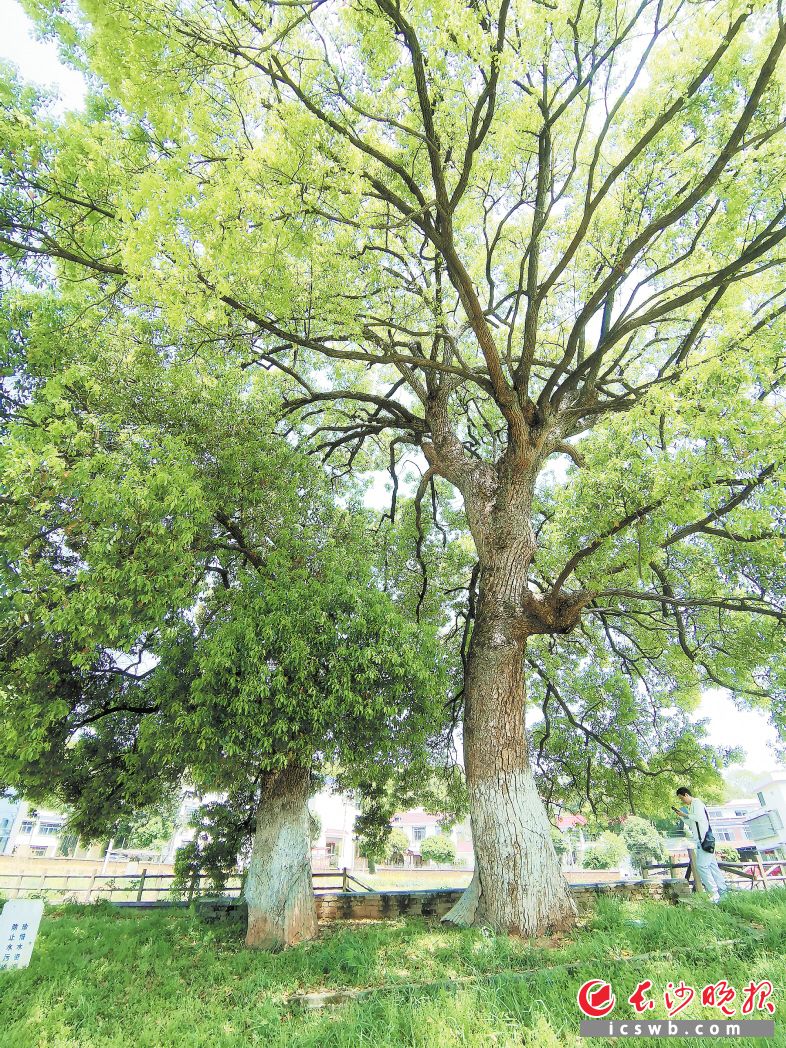 湖南湘江新区莲花镇曾家桥村,两棵百年樟树相依相偎在村口。
