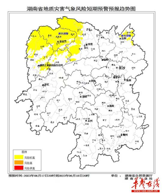 根据地质灾害成灾规律和孕灾条件,结合6月17日短期气象预报情况,湖南省自然资源厅与湖南省气象局联合会商得出如下结论:自6月17日20:00至18日20:00,受降雨影响,湘北部分区域发生突发性地质灾害风险较高(黄色预警)。