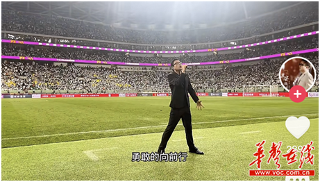 中场休息之时,经典的《早安隆回》旋律响起。袁树雄在场边舞动动感节奏,唱起这首“世界杯神曲”。歌声响动,不少观众们纷纷起身,跟随节奏和歌声,一起合唱这首因世界杯而火遍全网的歌曲。