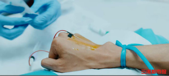 随着针头缓缓插进王靓的静脉,暗红色的血液,从手臂中流出,穿过输血管,进入“旅行第一站”——采血袋。