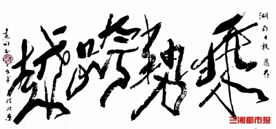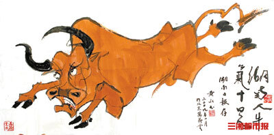 (在2009年新春佳节来临之际,黄永玉曾在北京作画、题字。寄语湖南日报报业集团“乘势跨越”;祝福乡亲父老——牛年“湖南人牛气十足”。)