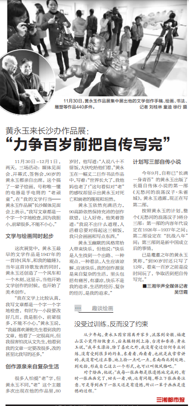 2013年11月30日—12月1日,“我的文学行当——黄永玉作品展”在长沙举行,90岁的黄永玉连续两天出席三场活动。前往采访的本报记者吴岱霞清晰记得,媒体见面会上的黄永玉侃侃而谈,“很多人怕提‘老’字,但黄永玉不同,‘老’这个主题多次出现在他的作品里。80岁时,他写‘人说八十不留饭,大伙吃给他们看’。黄永玉先生似乎永远充满活力,近百岁高龄依然保持着充沛的创作欲望,让人好奇。他笑着回答,‘我说不出什么道理,人活着总要对得起这三顿饭,我只会画画和写点东西’。”