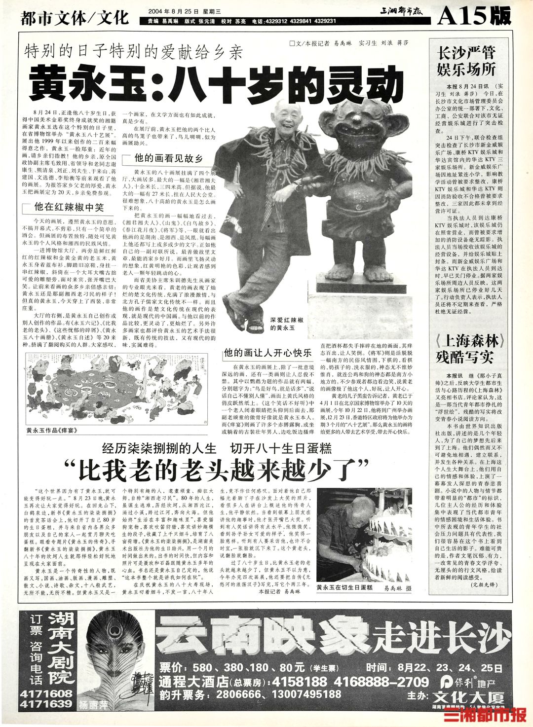 2004年8月24日,正逢80岁生日的黄永玉回到家乡湖南,在省博物馆举办“黄永玉八十艺展”。当时,本报记者易禹琳前往现场采访,记录了老人藏在红辣椒中的笑、画中的故乡,还有他一看就令人开心快乐的画。