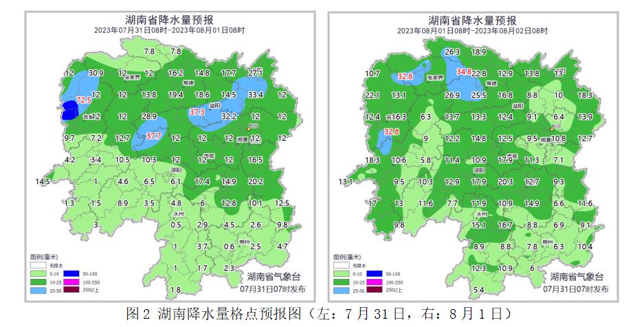 31日,多云间晴天,大部分地区午后有小到中等阵雨或雷阵雨,其中湘北、湘中局地大雨,保靖、花垣有暴雨(图2左);雷雨时局地阵风7级;最高气温湘西32~34℃,其他地区35~37℃。