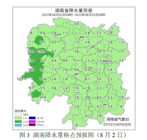 2.防范7月31日至8月1日湘北、湘中局地较强降雨可能诱发的山洪地质灾害、城市内涝等次生灾害及局地短时强降水、雷暴大风等强对流天气对交通安全(含水上交通)、临时建筑、户外设施及农业生产的影响。8月份午后对流性降雨较多,需关注气象部门预警信息。