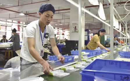 蓝山县工业园,大学生在生产线上实习。杨雄春 刘爱菊 摄