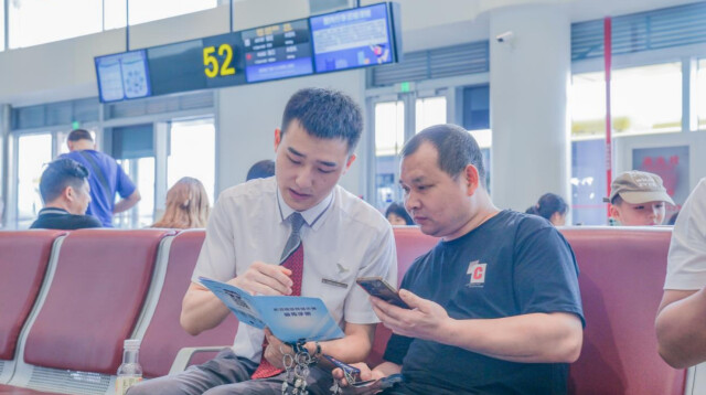 (湖南航空志愿者为旅客讲解宣传册。)