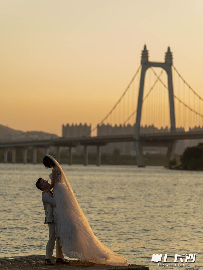 江畔,年轻朋友正在与三汊矶大桥打卡合影。