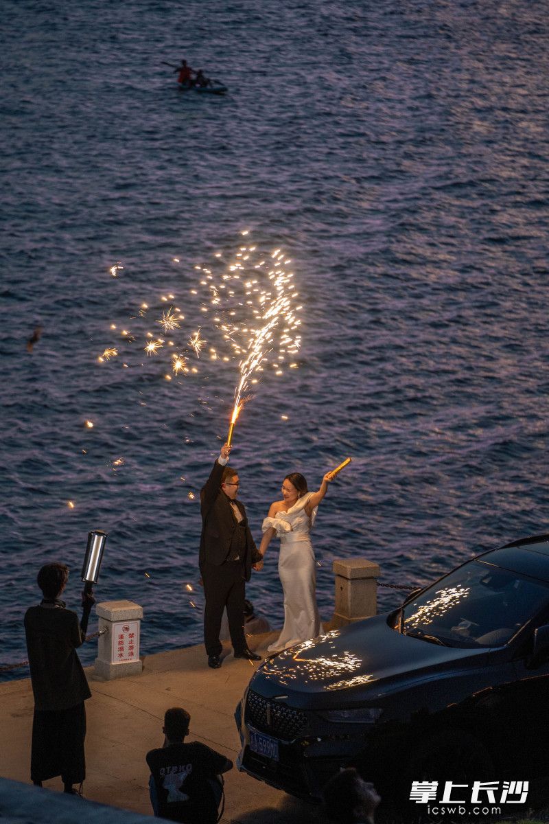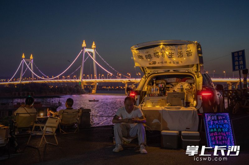 移动餐车正在兜售咖啡,江边有年轻朋友与地标打卡合影,还有不少市民乘着习习江风拍摄婚纱照……随着小红书等社交媒体相关推文的快速传播,这里逐渐成为人们消暑纳凉的网红打卡点。