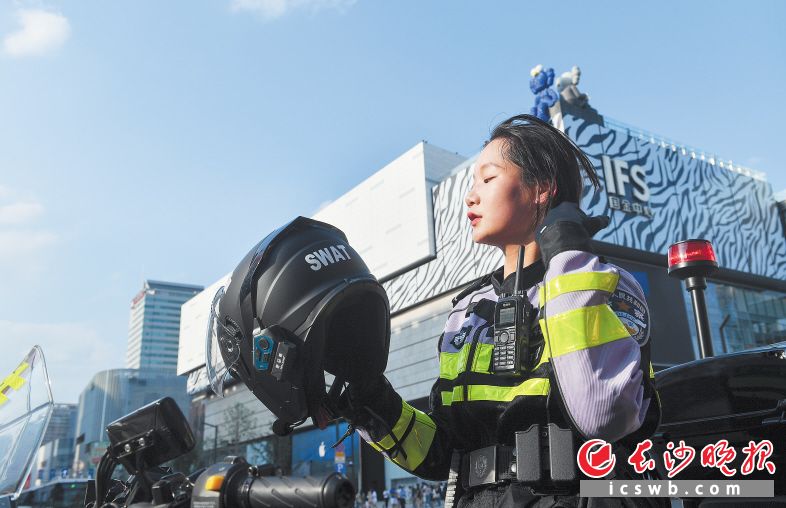 ▲女特警巡逻两圈后取下头盔,汗水已把头发粘在一起。均为长沙晚报全媒体记者邹麟 摄