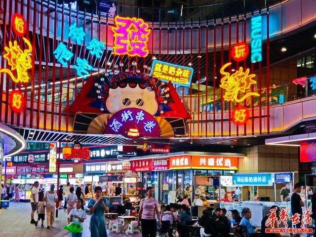 行程的第四站是福元路商圈,福元路商圈东接马栏山视频文创园和星沙片区,西连湖南金融中心,往北是金霞经济开发区,向南是芙蓉路金融生态区和五一商圈。在中间的福元路商圈,与长沙东、西、中、北一起,奏响了长沙二环内城市商业升级的交响曲。润和国际广场彩虹park,更是其中的代表,位于开福区马厂地铁口附近,是润和城集团着力全新打造的以夜经济为主的商业综合体,属于开福区福元路商圈的龙头片区,也是被长沙市开福区政府授予的首个“夜间经济示范街区”。在这条新中式国潮美食街中,网红打卡、聚会、溜娃、用餐都能一站式解决,各种摊位小吃应有尽有,汇聚了超百种来自五湖四海的特色美食。凭独门牛扒俘获一众资深老饕的甜胡椒扒房、回味无穷唇齿留香的茶颜悦色奶茶、驻唱给力氛围十足的啤客走廊·Music PUB等等,各式各样的精彩与长沙的夏夜更配。不仅如此,这里还有绚丽的灯光秀、超大草坪和露营小帐篷。约上三五好友,伴随着音乐、美食,在新潮与复古交织的场景空间沉浸式体验长沙夜生活,真是既热闹又浪漫。