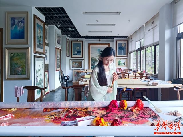 感受到长沙历史的魅力,大V行第二站老师们随后来到了中国湘绣之乡沙坪,体验汉回村民俗文化,看绣娘针线飞舞。在沙坪,你可以沉浸式领略“针尖上的湖湘之美”。现场,讲解员将湘绣的精湛技艺、历史的传承发展以及当代湘绣的创新突破娓娓道来。大v们还在此亲手体验刺绣,在操作过程中感受传统手工艺品独具一格的魅力。