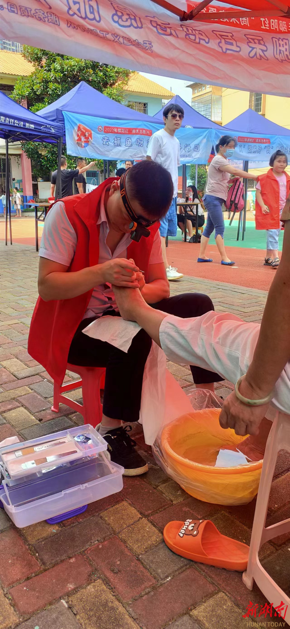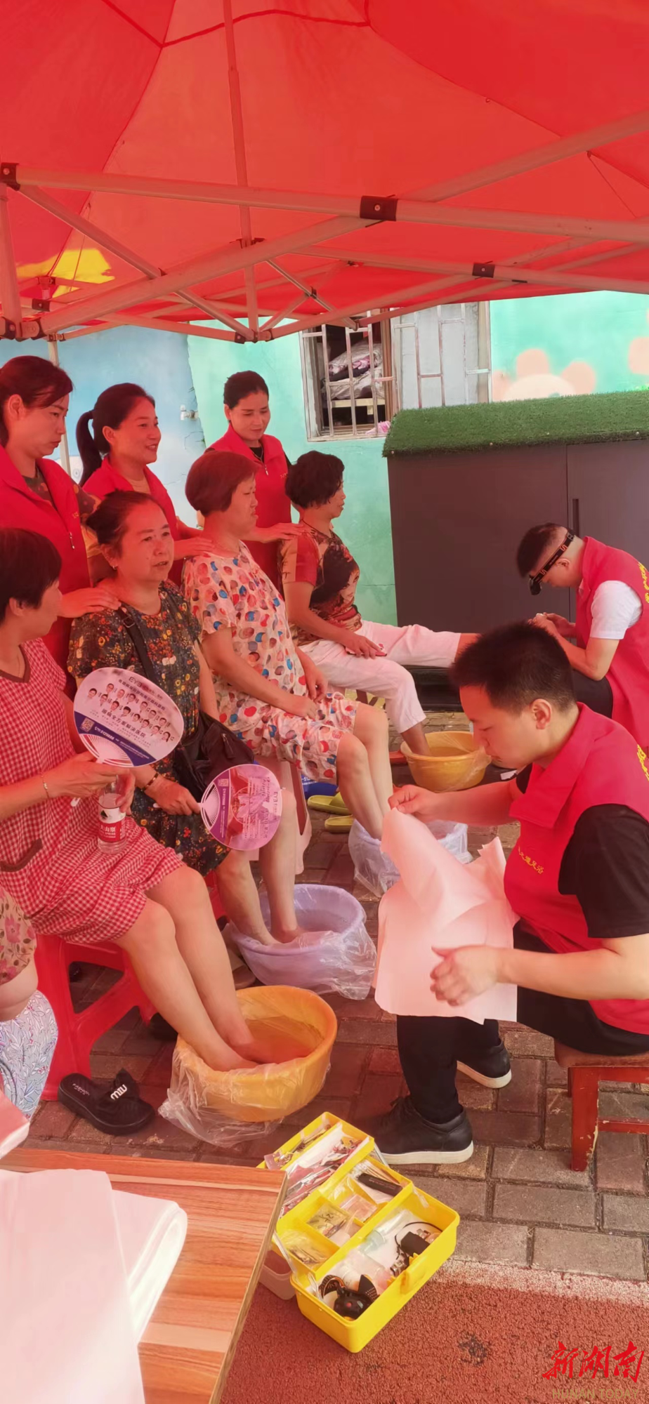 华声在线7月9日讯(记者 郑丹枚)“奶奶,你这个脚趾甲已经长到肉里了,我帮您修一下。”“老人家,您耳朵有点发炎,我帮您涂点药。”......7月8日上午,邵阳市大祥区红旗路街道大安街社区爱心涌动。当天,邵阳市天之道义工服务队的10余名志愿者,正在给社区老人提供免费的修脚、采耳、按摩服务。
