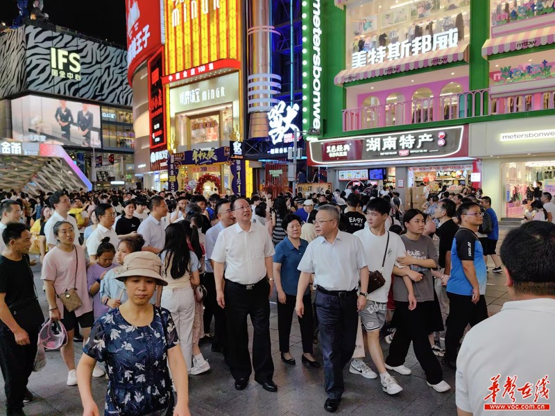 (7月3日晚,沈晓明毛伟明一行来到五一商圈,沿着黄兴南路步行商业街边走边看,察看户外广告牌、疏散通道等存在的安全隐患。)