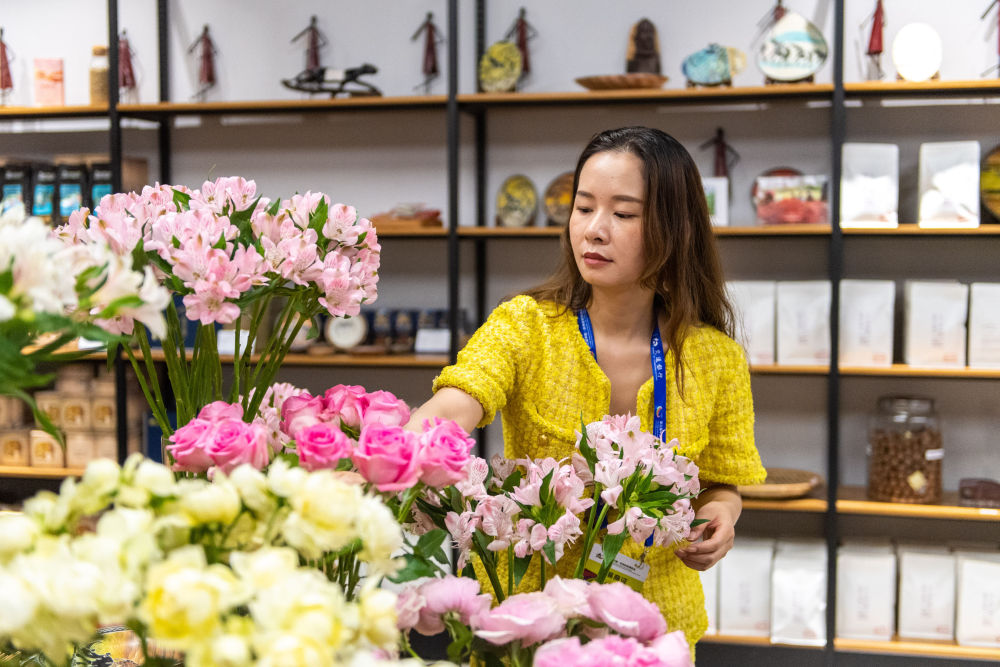 7月1日,中非经贸博览会常设展馆展区肯尼亚馆馆长黄梓楠在整理产自非洲的鲜花。 新华社记者 陈思汗 摄