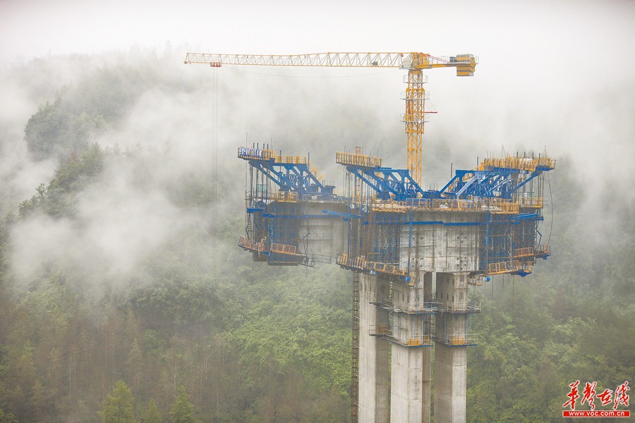 7月1日,龙山县茨岩塘镇双新村,桑(植)龙(山)高速公路湾档河特大桥工地,工人在加紧桥墩施工。