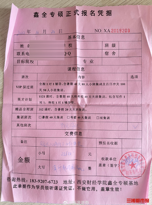 “我是在班级老师的推荐下,选择了这家培训机构的。”高同学今年读大四,她告诉记者,2022年10月自己与另外两名准备考研的同学,在老师推荐的数家考研培训机构里选择了北京鑫全教育。