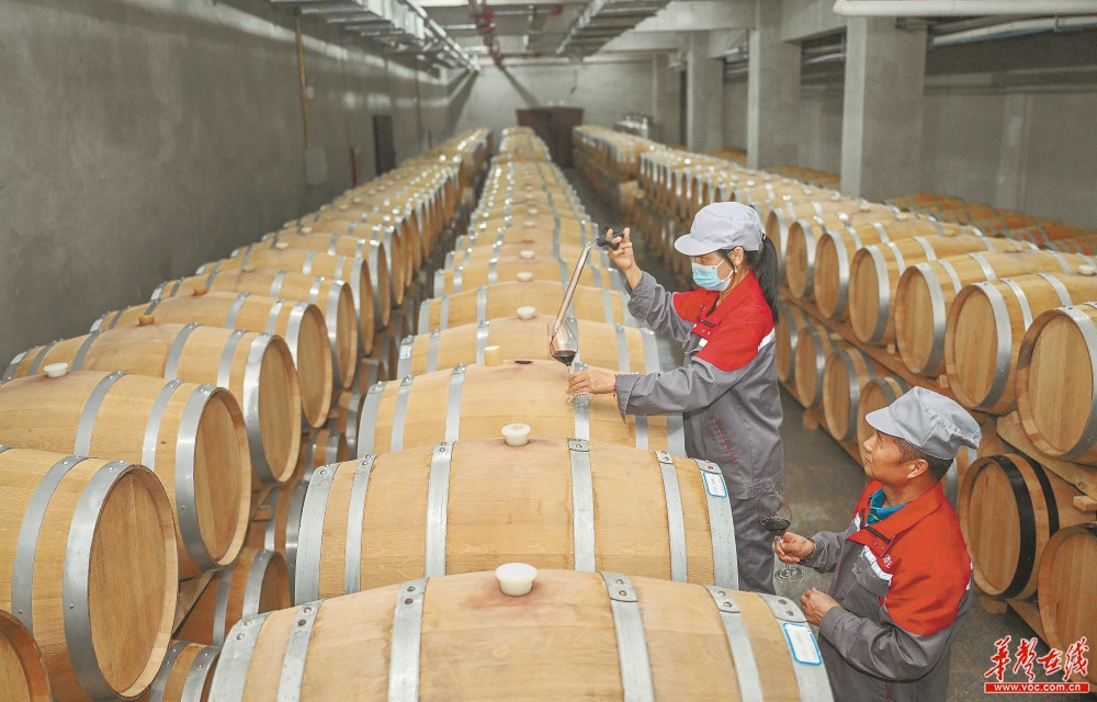 8月20日,吐鲁番市亿茂酒庄,工作人员在酒窖里检查葡萄酒的品质和口感。目前,该市已开发干红、干白等7大系列250多个品种的葡萄酒,有效延伸了产业链。