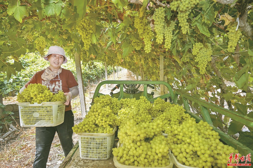 绯红剔透如玛瑙的玻璃脆、翠绿中透着鲜嫩的无核白……一串串壮硕的葡萄挂满藤蔓,弥漫着阵阵果香。