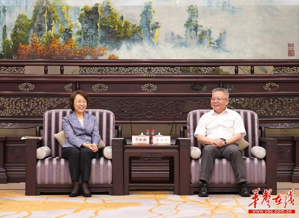(8月14日,沈晓明在长沙与中宣部副部长,国家广播电视总局党组书记、局长曹淑敏一行会谈。)