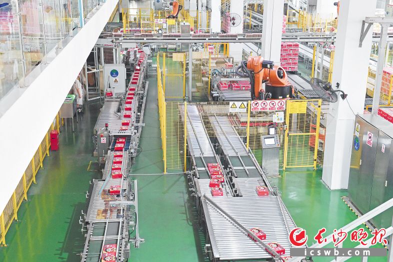 “工人这么少,干的活却这么多,这些工厂真是太神奇了!”在湖南大旺食品有限公司的生产车间,我好像在看机器人总动员:一眼望不到边的运输皮带组成一条盘旋“赛道”,一罐罐旺仔牛奶如同长跑队员,排着队向前不停地自动奔跑,不知疲倦。不远处,一个个黄色的机械臂自动挥舞,将抵达目标点的旺仔牛奶包装成箱,然后轻松提起,送往“终点”。