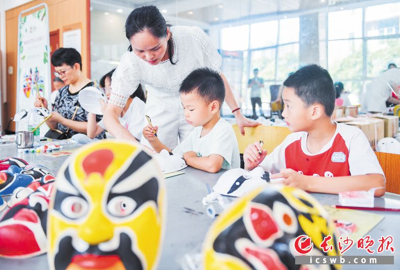 长沙市群艺馆暑假开展少儿社会实践公益活动——“书画少年的天空”,孩子们正在体验手绘脸谱。